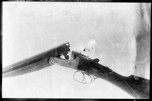 Open breech of a shotgun. Engraving reads as Fred Ward.