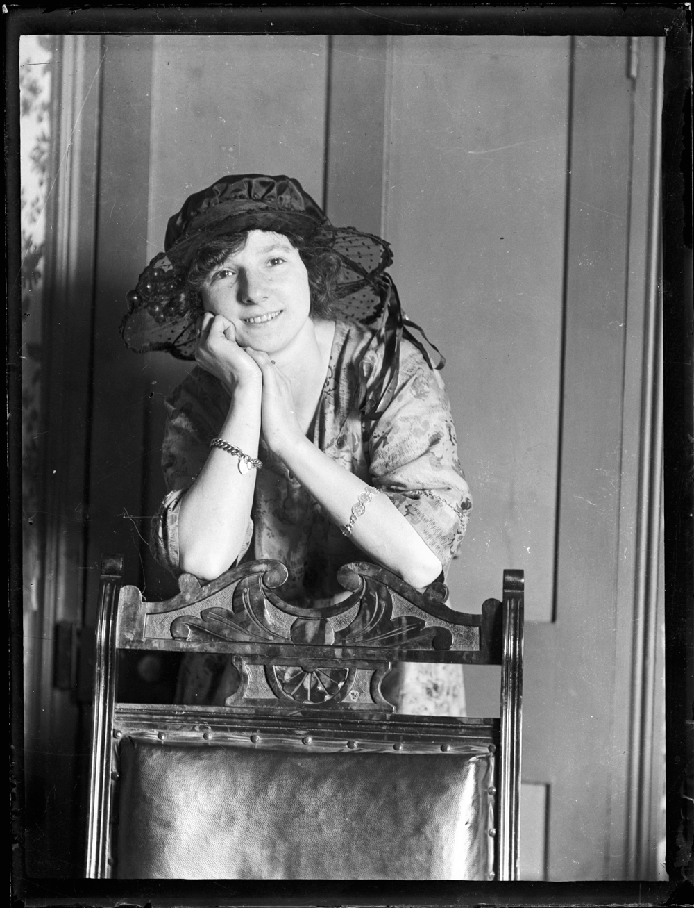Portrait of woman behind chair, taken with flash.
